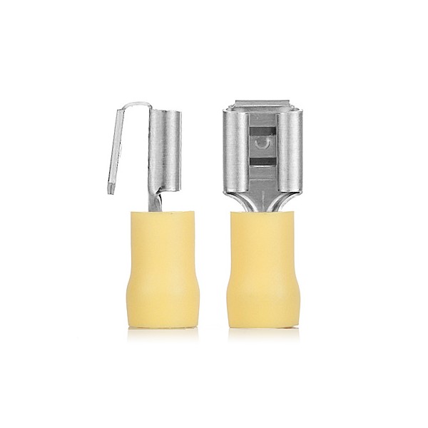 Terminal faston mixto hembra y macho de latón estañado preaislado en PVC de color amarillo. Las medidas son: interior hembra 6,3mm, exterior macho 6,3 y largo 23,8. Uso para cables de sección 2,5 a 6,0mm2. El cable se ajusta al terminal mediante crimpado.