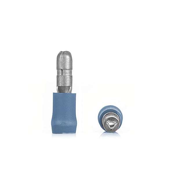 Terminal cilíndrico macho de latón estañado preaislado en PVC de color azul. Las medidas son: exterior 3,96mm y largo 20,3. Uso para cables de sección 1,5 a 2,5mm2. El cable se ajusta al terminal mediante crimpado.