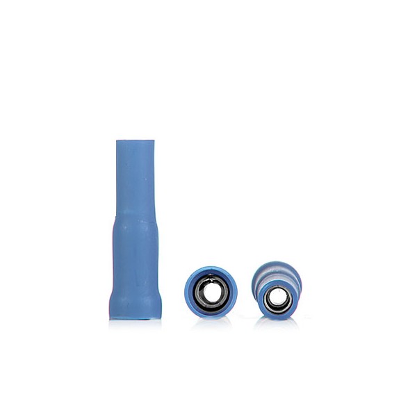 Terminal cilíndrico hembra de latón estañado aislado completamente en PVC de color azul. Las medidas son: exterior 3,86mm y largo 23. Uso para cables de sección 1,5 a 2,5mm2. El cable se ajusta al terminal mediante crimpado.