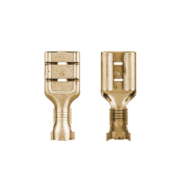 Terminal faston hembra de latón, desnudo. Las medidas son: interior 7,6mm y largo aproximado de 19mm. Para machos de 6,3mm de exterior. Útil para cables de sección 4,0 a 6,0mm2. El cable se ajusta al terminal mediante crimpado.