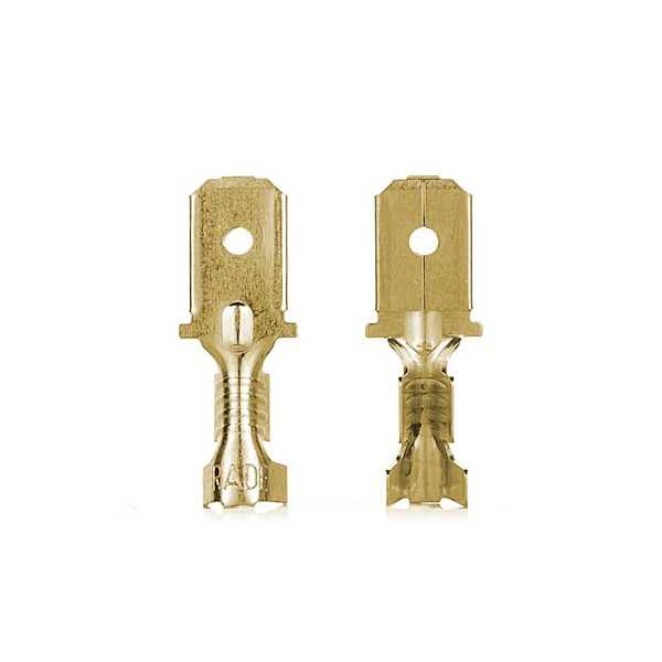 Terminal faston macho de latón, desnudo. Las medidas son: exterior 6,3mm y largo aproximado de 20mm. Útil para cables de sección 1,0 a 2,5mm2. El cable se ajusta al terminal mediante crimpado.